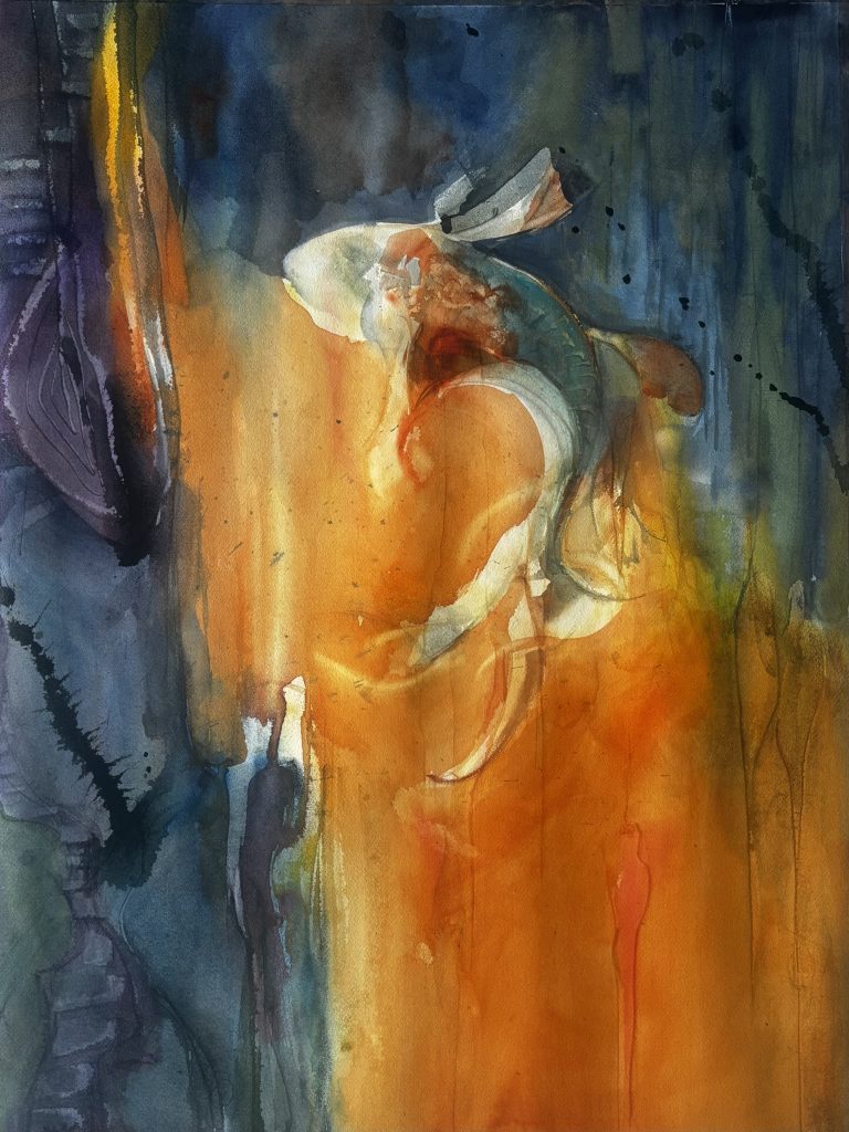 Observa detenidamente la obra, en la base, abajo a la derecha, el naranja brota como una brasa viva, un latido de calor que asciende. Es la fuerza interior, la pasión que empuja y reclama espacio en el papel.